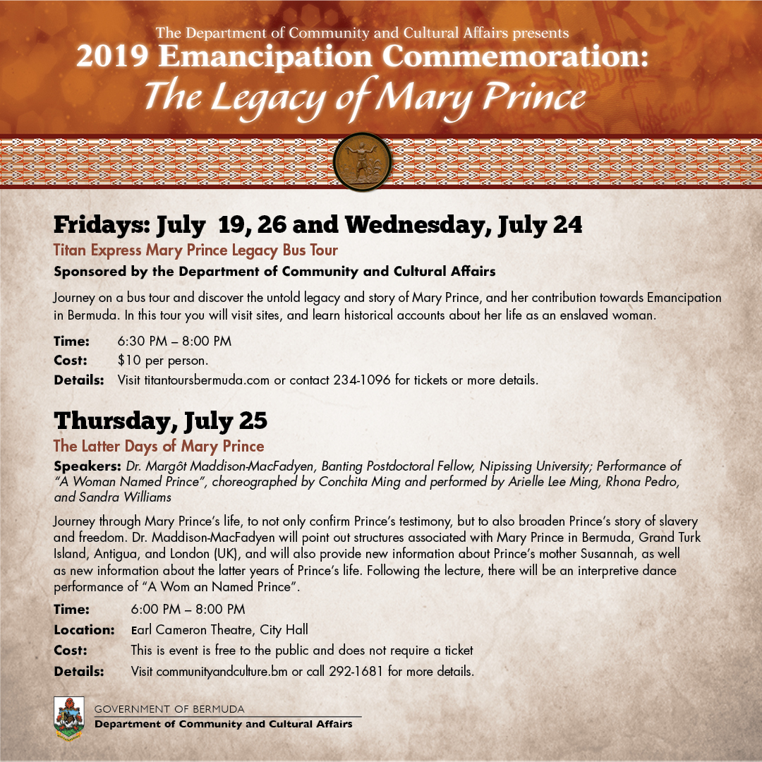 Mr. Speaker, the Department of Community and Cultural Affairs has partnered with Titan Express to offer a historical bus tour providing highlights of Mary Prince’s autobiography, visiting three of the sites that she mentions in her book. This tour is running throughout the month of July, and as it stands those tours are already sold out, so we have put on four more tours for the month of August. We congratulate Rashida Godwin and her team at Titan Express for developing this kind of offering; given the level of public interest and value to cultural tourism, we thank Titan for considering the extension of the tours into August and hopefully throughout the year.