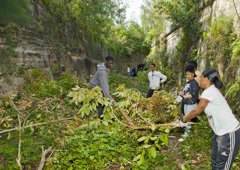 Addressing the crowd before work began the Minister said, "Today I am thrilled to announce the launch of the Fort Cunningham and Paget Island Restoration Project, which is being spearheaded by the Mirrors Programme as part of their 10th year celebration activities. Thank you to all those who made this possible - Kimberley Jackson and her dedicated team at Mirrors, the folks at Outward Bound, The Department of Youth, Sport and Recreation, The Department of Parks, The National Museum, The Bermuda National Trust, Keep Bermuda Beautiful and of course all of our wonderful volunteers.