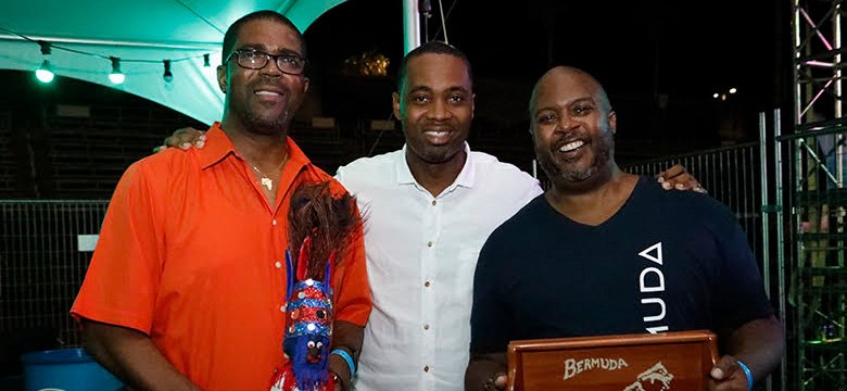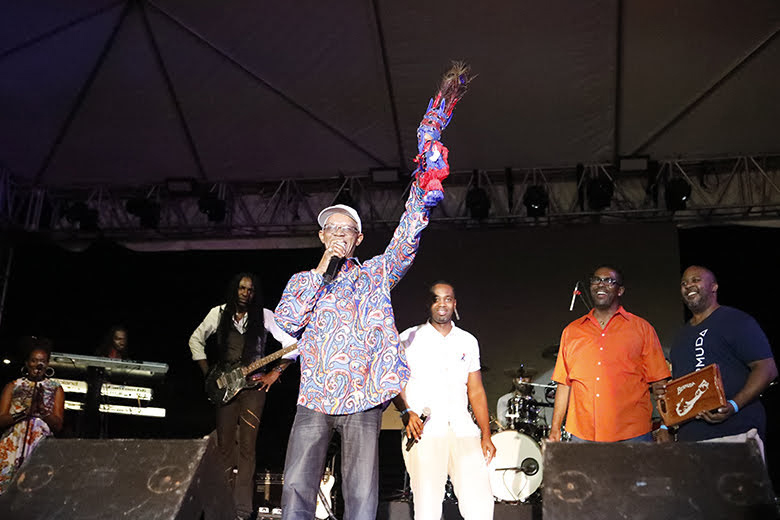 During the Cup Match Summer Splash, One Love One Life Concert held over the weekend, Premier and Minister of Finance, the Hon. David Burt, JP, MP, thanked the Grammy-nominated reggae artist, the Hon. Beres Hammond, for his musical contributions. The Premier also recognized that Mr. Hammond has been traveling to and performing in Bermuda since 1975.The Premier was joined on stage by the Minister of Social Development and Sports, the Hon. Michael Weeks, JP, MP, and the Minister of Economic Development and Tourism, the Hon. Jamahl Simmons, JP, MP, who presented a handmade Gombey doll and a cedar tray with the map of Bermuda engraved on it, respectively. The Gombey doll was made by Mrs. Janice Warner-Tucker and the tray by Mr. Anthony Flood who is an inmate at the Department of Corrections.