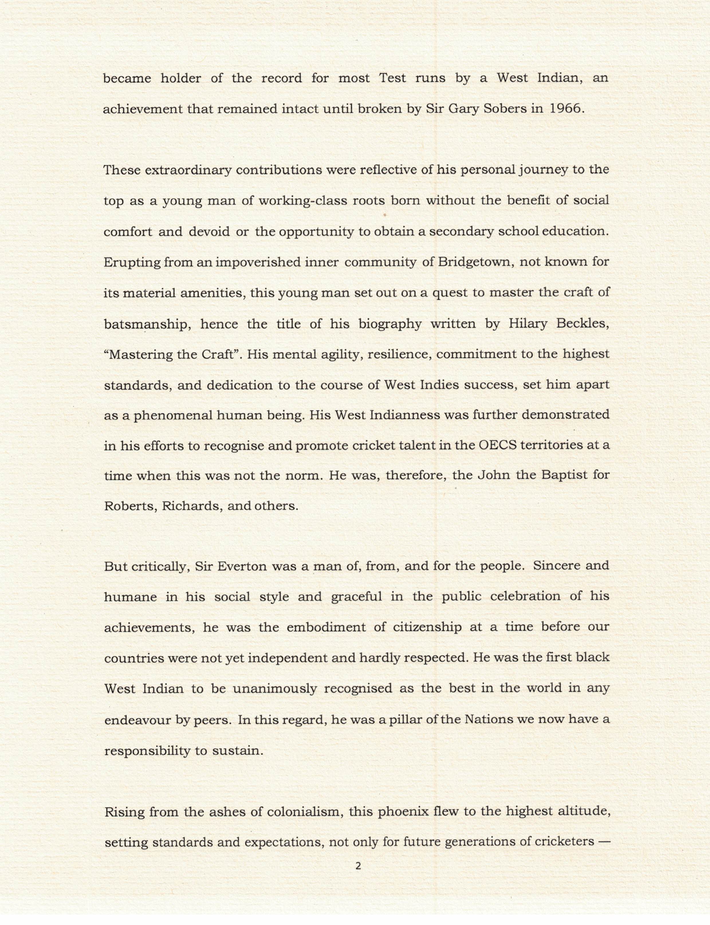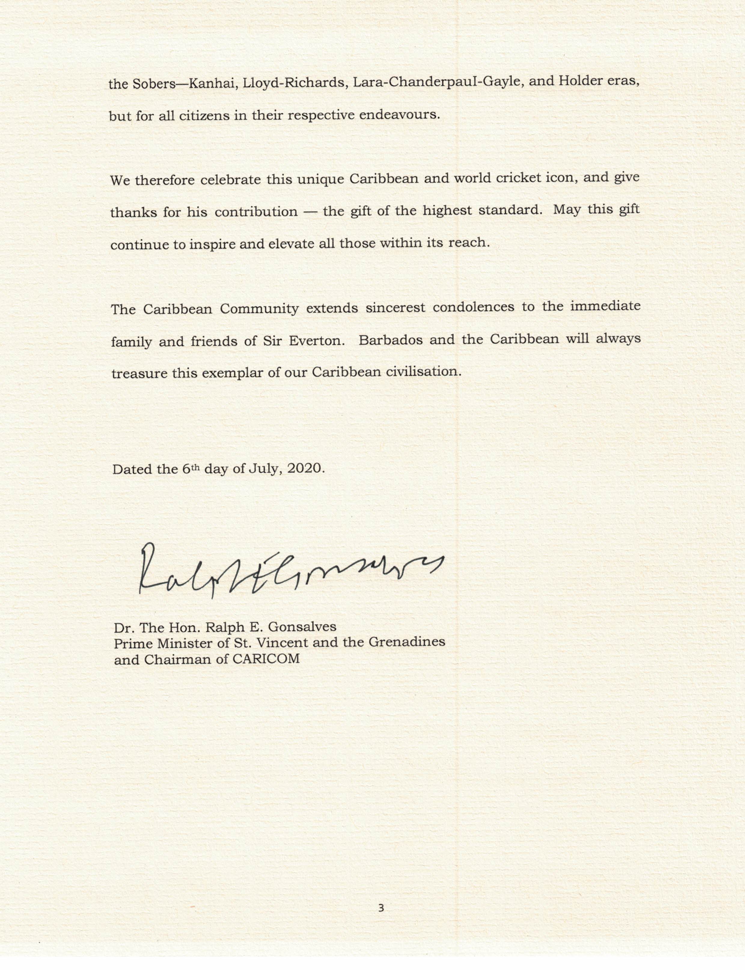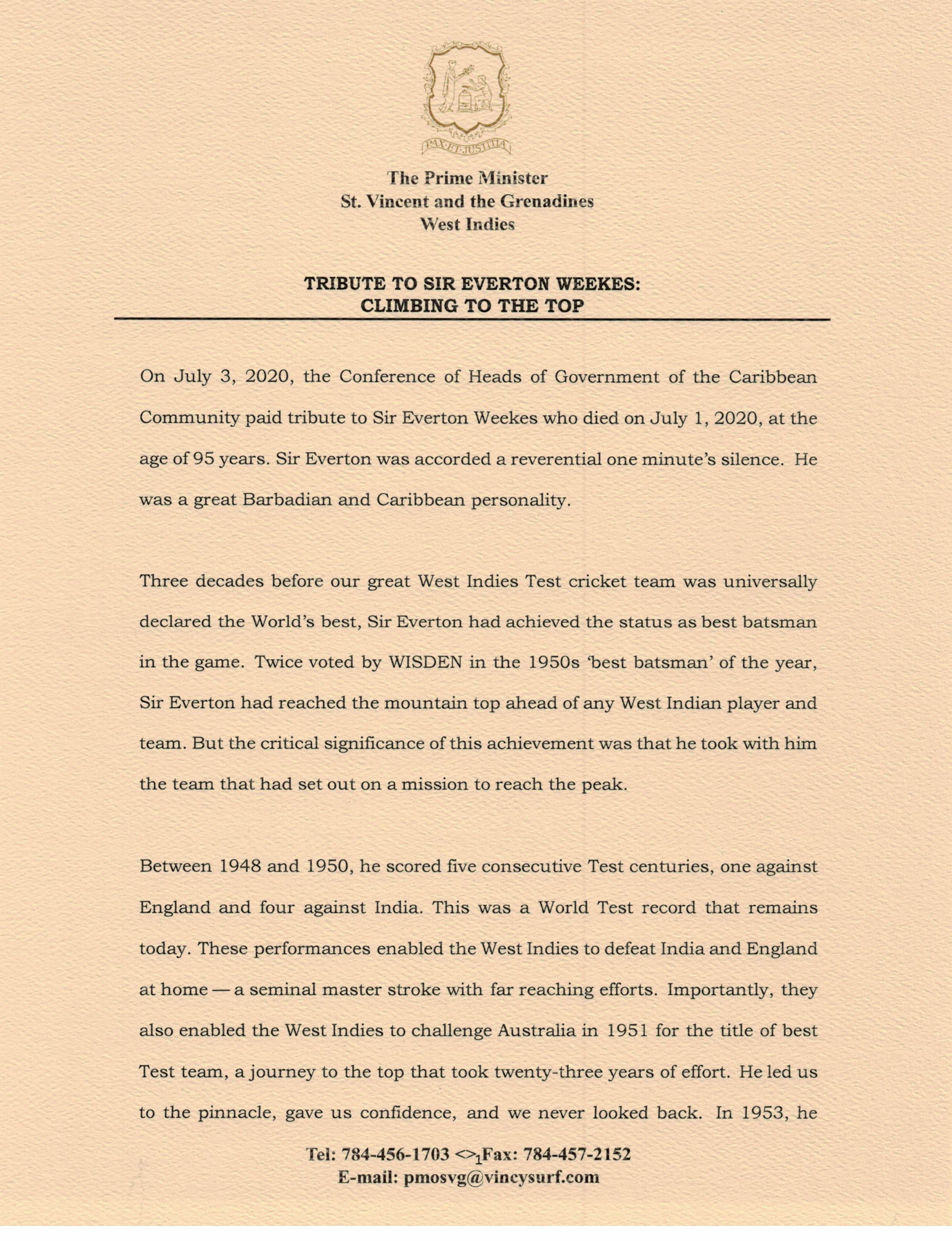 Sir Everton Weekes, who died on July 1, 2020, at the age of 95 years, was an internationally renowned cricketing great, a native of Barbados and one of the trio of West Indian batsmen known as “The Three Ws”. On July 3, 2020, the Conference of Heads of Government of the Caribbean Community paid tribute to Sir Everton, who was accorded a reverential one minute’s silence.