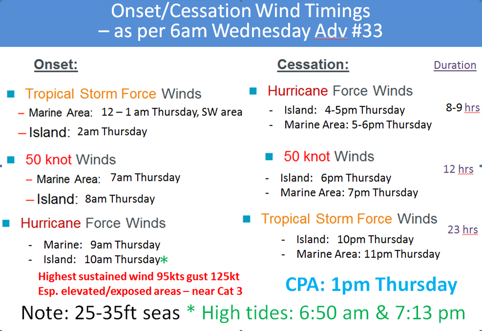 Overnight Nicole became a Cat 2 hurricane, with 85 gusting 105 knots. Hurricane hunters are in the hurricane now and we are getting data to support this increased intensity forecast. Nicole has also not progressed forward as fast as they were predicting yesterday, which is not good because it means that it will spend more time in that region of above average sea surface temps and very low wind shear – all ingredients for further intensification… which is why their write ups are hinting at the possibility of Nicole reaching major hurricane (Cat3) strength prior to landfall here. Please note however, that the speed thus duration of conditions for Bermuda remains the same as previous advisories, NHC expect it to be moving over us at a steady pace. With the slowed down approach, the local wind timings have been adjusted as follows, with TS winds lasting late night Thursday: