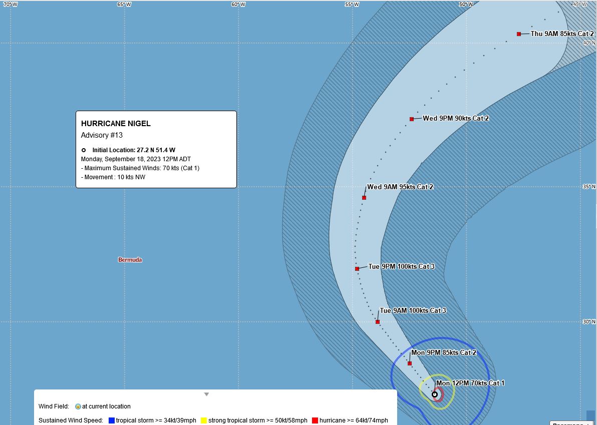 Following the 12noon forecast from the Bermuda Weather Service (BWS) Hurricane Nigel is not considered to be a threat to Bermuda at this time. Nigel’s closest point of approach to Bermuda is forecast to be around 508 nautical miles to the east at 9.00 pm on Tuesday September 19, 2023.