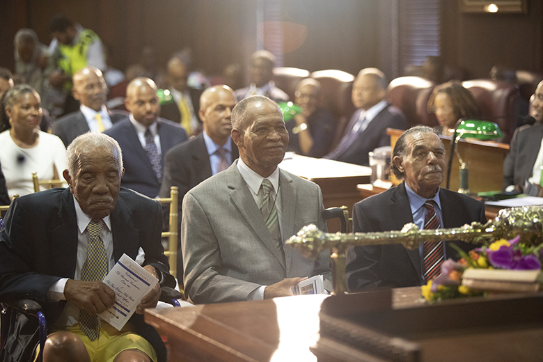 Photo: The Joint Session of the Legislature to mark the 50th Anniversary of Universal Adult Suffrage in Bermuda (2018): The Late the Hon. C.V. Jim Woolridge CBE, JP, The Late Mr. Morton and The Late the Hon. Stanley W. Lowe OBE, JP